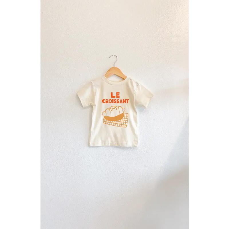 Bring a touch of Parisian charm to your little one's wardrobe with this delightfully French-inspired tee. Featuring "LE CROISSANT" in bold orange lettering alongside an adorable illustration of golden croissants nestled in a wicker basket, this shirt captures the essence of a cozy French bakery morning.